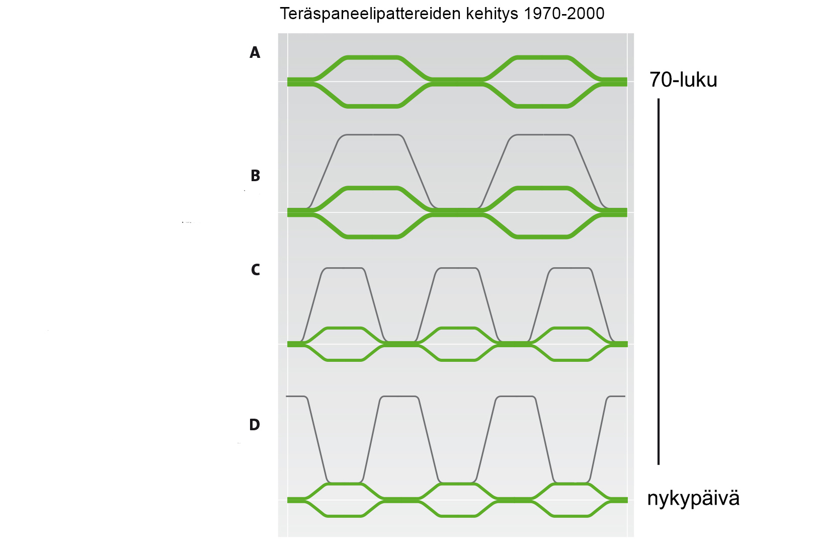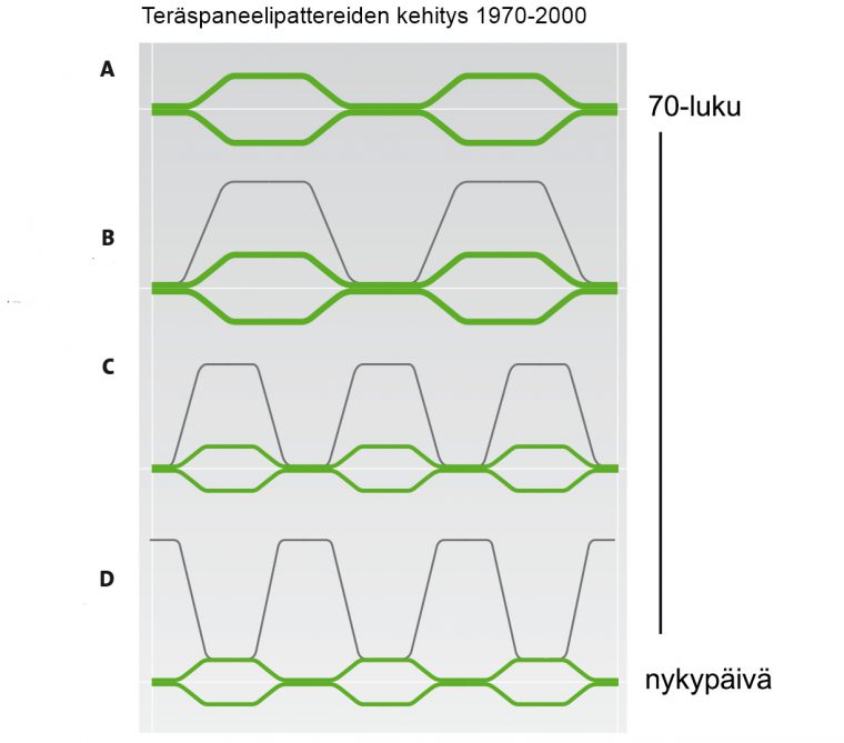 Patterit ovat kehittyneet paljon 40 vuoden takaisista kömplelöistä malleista. Varhaisissa teräspaneeleissa rakenne oli tasainen ja ne sisälsivät paljon vettä (A). Seuraavassa vaiheessa otettiin käyttöön vesikanavien väliin jäävät konvektiolaipat, jotka kasvattivat lämmöntuotantoa (B). Ajan mittaan huomattiin, että lämmöntuotantoa voidaan lisätä vähentämällä patterin sisältämän veden määrää ja sijoittamalla laipat kiinni lämpimämpiin kanaviin (C ). Vasta kun kanavat oli litistetty kuusikulmaiseen muotoon, saatiin kontaktipinta maksimoitua ja pattereiden lämmöntuotanto täysin optimoitua (D).