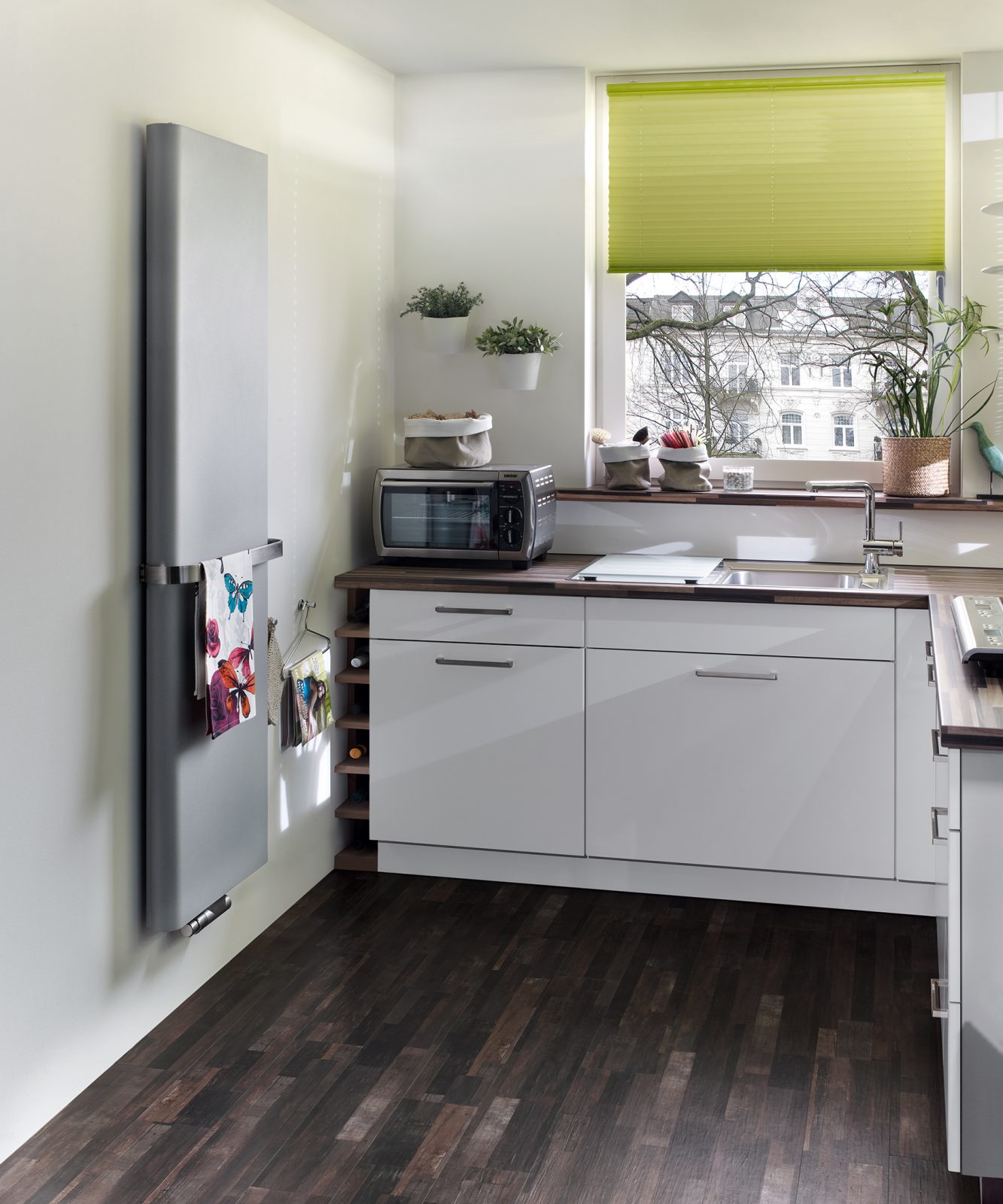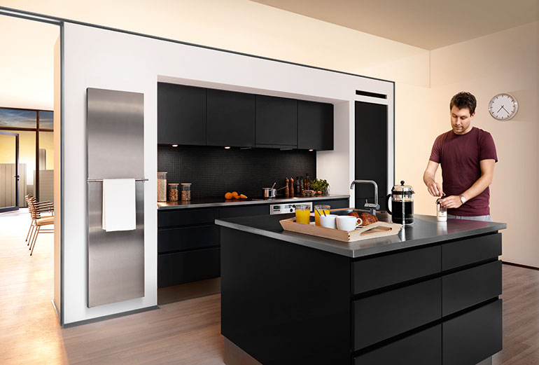 Kapeat väliseinät on hyviä paikkoja keittiön pattereille. Pystysuuntaiseen patteriin saa myös pyyhetelineen, johon voi ripustaa keittiöpyyhkeitä ja -liinoja.